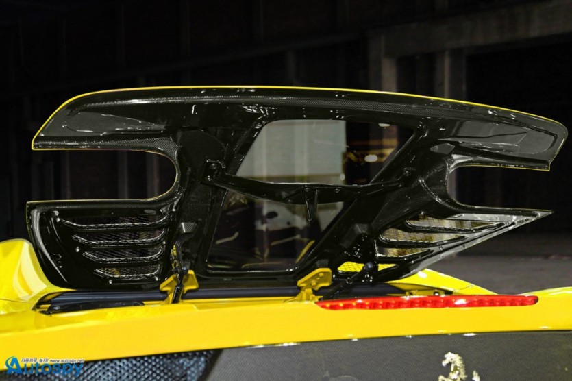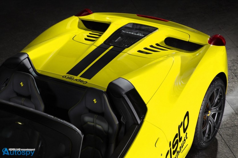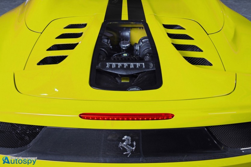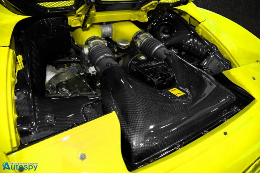 독일 튜너 카프리스토(CAPRISTO)가 페라리 458 스파이더 오너를 위해 새로운 프로그램을 선보였다. 노란색의 보디를 제외하면 외형적인 변화는 크지 않다. 다만 조금 더 많은 공기를 엔진룸으로 보내기 위해 엔진 커버를 새로 제작했다. 그리고 그 안쪽으로 볼트온 방식의 카본제 대용량 에어박스를 달아 25Nm 정도의 토크 증대 효과를 가져왔다.