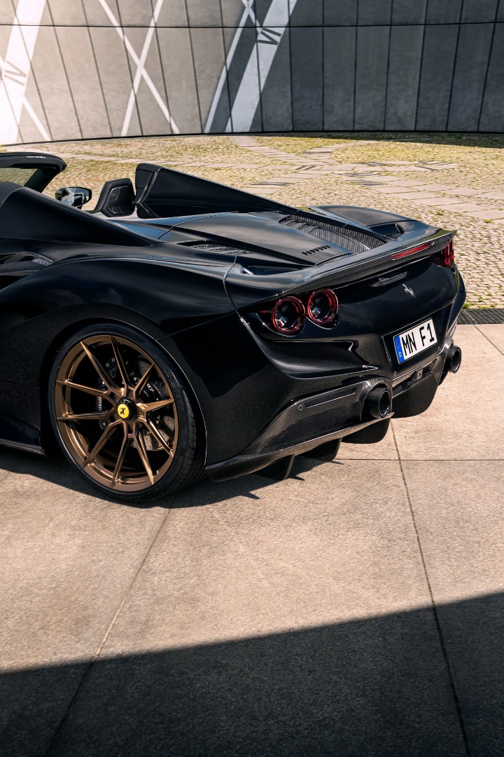Novitec의 F8 Spider 에는 Vossen과의 협력으로 제조된 Novitec NF10 단조 림 세트도 있습니다. 그들은 255/30 ZR 21 및 335/25 ZR 22 고성능 타이어를 장착하고 앞 21인치, 뒤 22인치를 측정하고 있습니다. 디스플레이 차량에서는 검정색 차체와 대조되는 Satin Bronze로 마감되어 있지만 Novitec은 다른 색상 옵션을 많이 제공하고 있습니다.