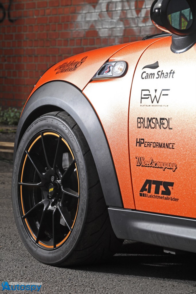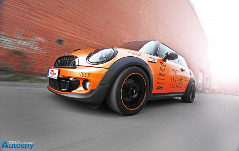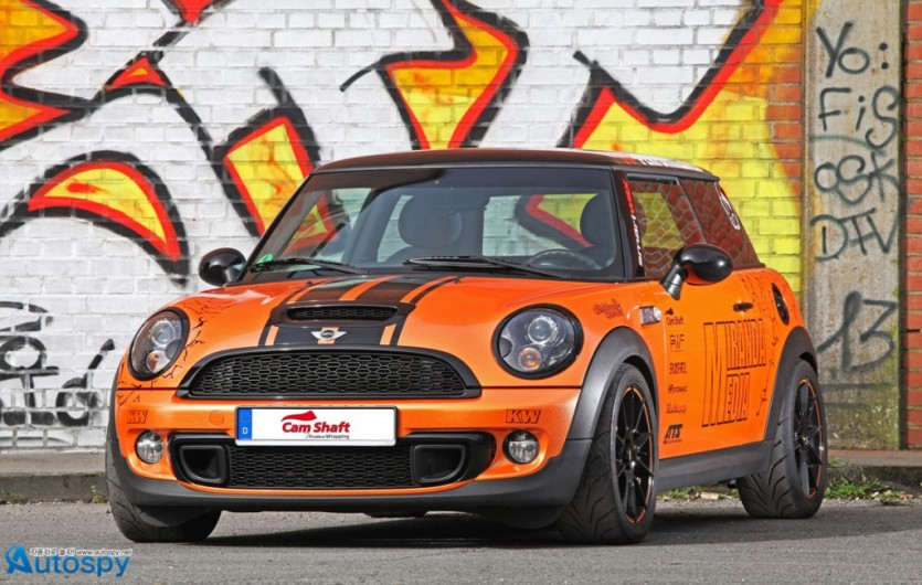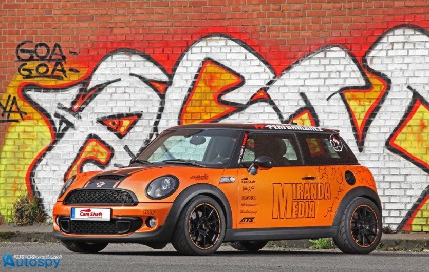 튜너 캠 샤프트(Cam Shaft)와 PP 퍼포먼스가 2세대 미니 쿠퍼 S의 변신을 위해 손을 잡았다. 이들이 만들어낸 커스텀 미니 쿠퍼의 특징은 화려함과 고성능. 캠 샤프트는 펄이 들어간 샤이니 오렌지 컬러로 보디 전체를, 광택이 선명한 블랙 필름으로 루프와 크롬 테두리를 덮었다.