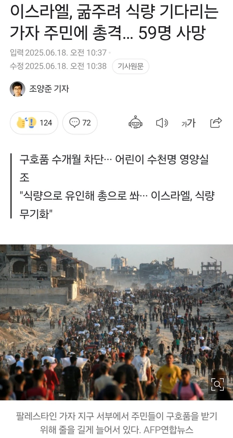 이스라엘, 굶주려 식량 기다리는 가자 주민에 총격… 59명 사망