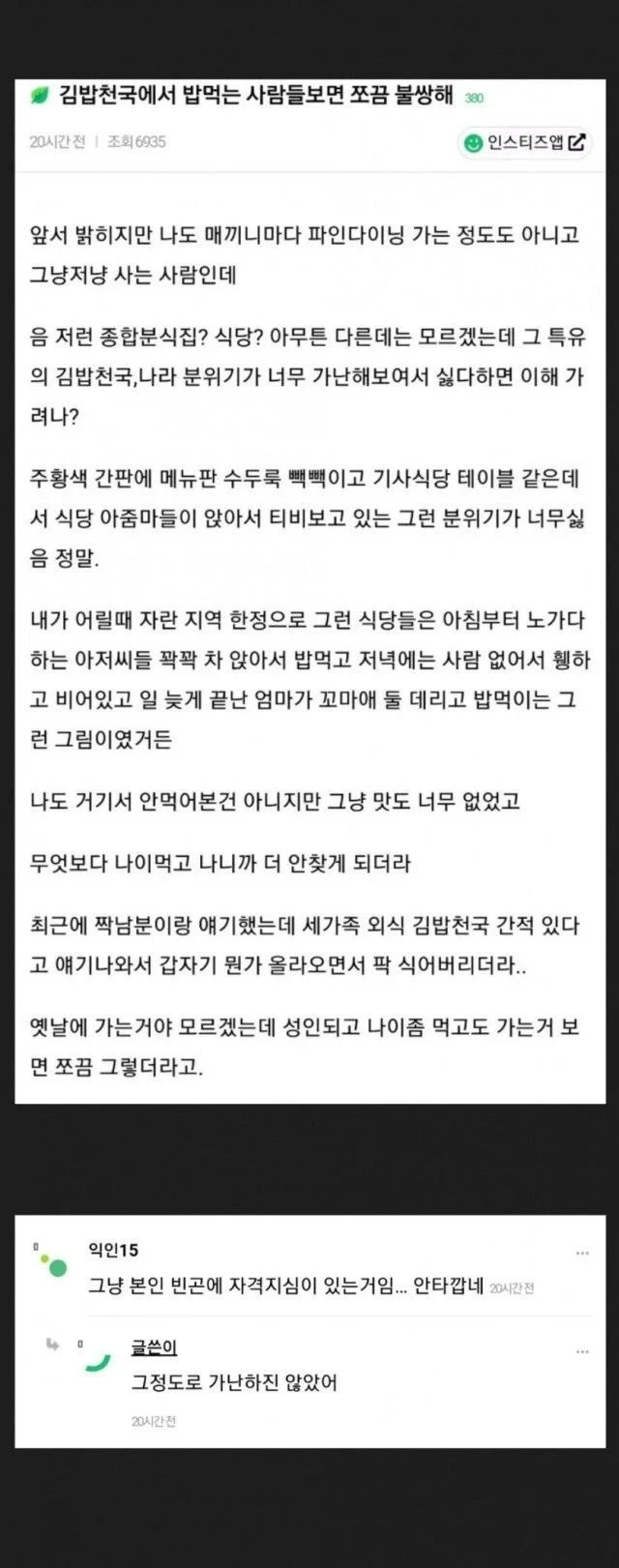 김밥천국 에서 밥 먹는 사람들 보면 불쌍하다는 사람