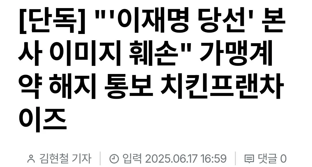 "'이재명 당선' 본사 이미지 훼손" 가맹계약 해지 통보 치킨프랜차이즈