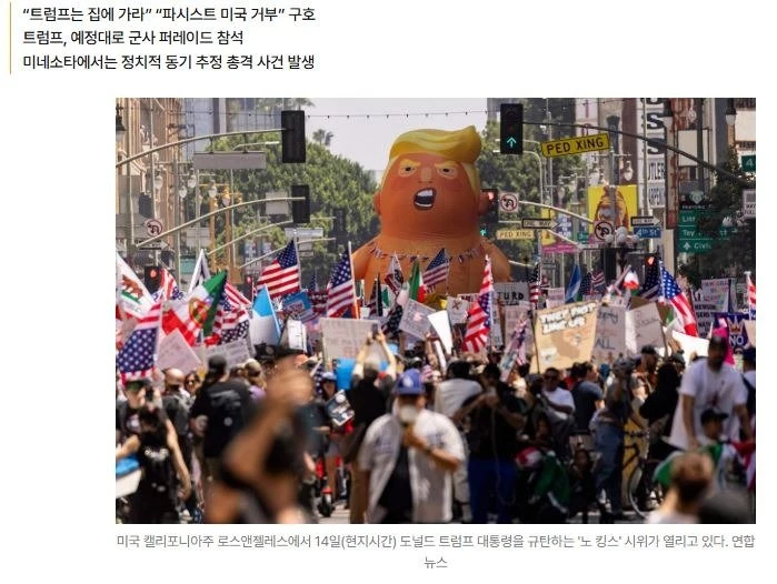 ICE의 강경한 탄압으로 반트럼프 집회가 촉발된 로스앤젤레스(LA)에서도 대규모 집회가 열렸다. 시위대는 해병대가 배치된 다운타운 연방 건물 주변으로는 ‘해병대는 LA에서 나가라’ ‘반역자’ 등의 구호를 외쳤다. 트럼프의 사진에다 ‘왕이 아닌 범죄자’라고 적힌 팻말을 든 시위대도 있었다.