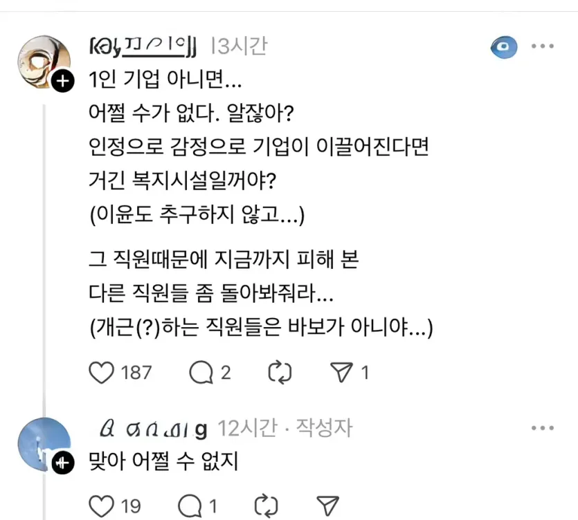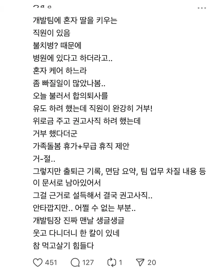애 때문에 자꾸 빠지는 직원이 있어서
