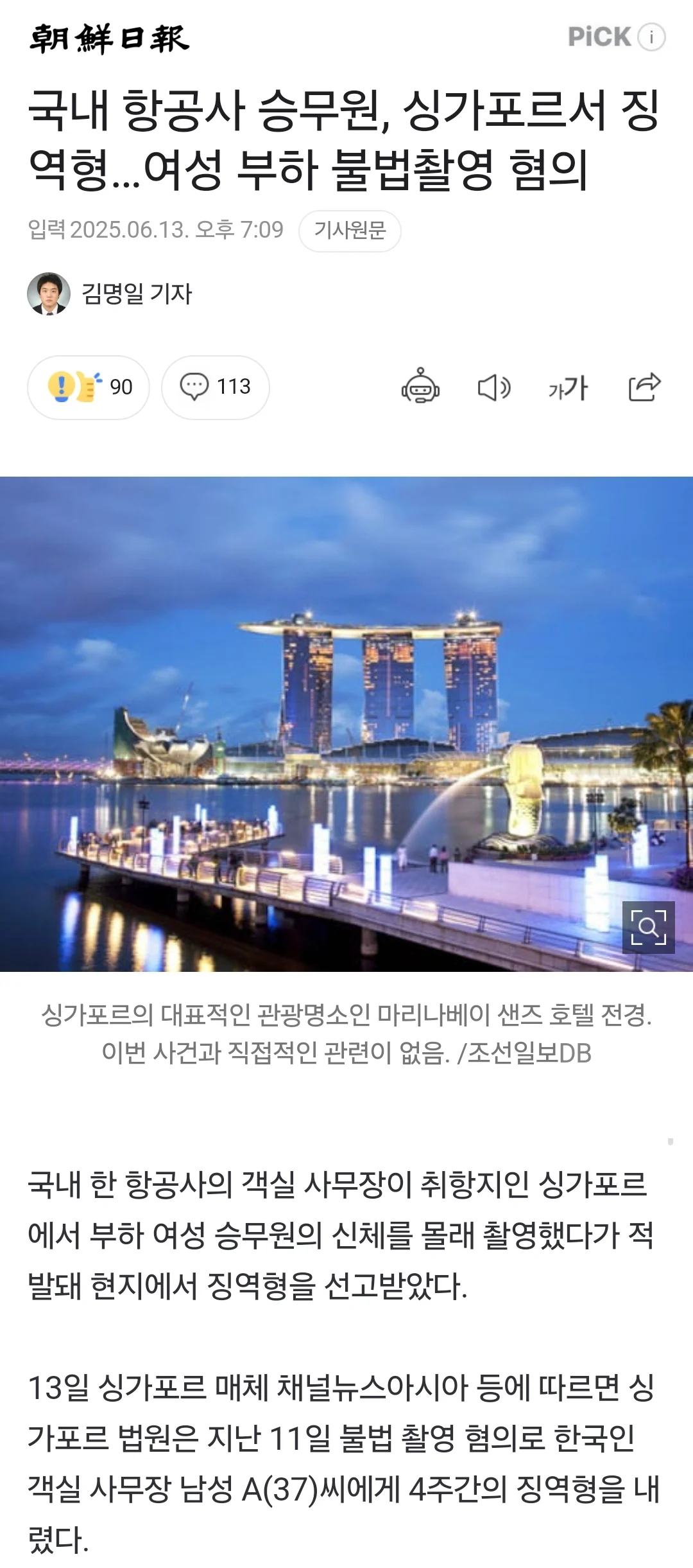국내 항공사 승무원, 싱가포르에서 부하 직원 몰카