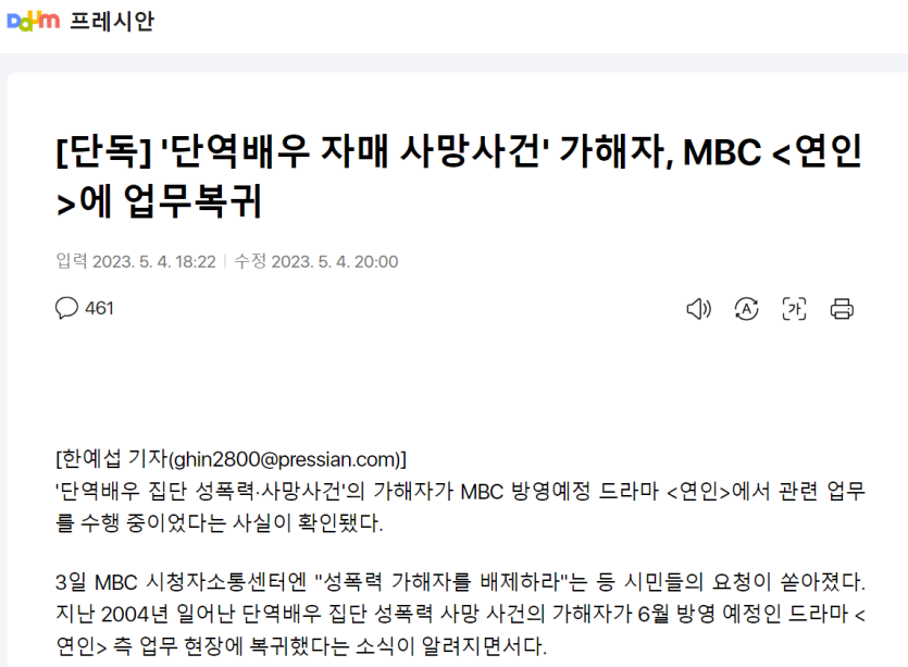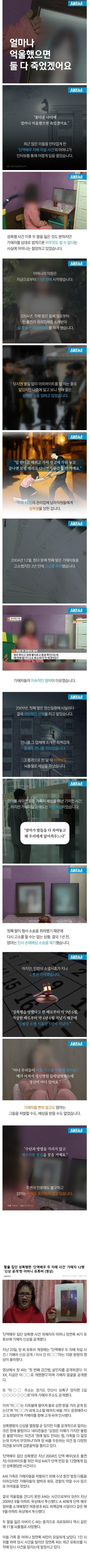 두자매를 자살로 몬 성폭행범 얼굴 공개ㄷㄷ rh1 0 104 0 2025.06.14 06:45 1. 자매 둘은 투신자살 했고아버지는 충격으로 뇌출혈 와서 사망하심..2. 한순간에 가정이 파탄나고어머니 혼자 남아서 아직도 1인시위 하시는중..유튜브 보면 어머님 정신건강이 많이 불안정해 보이심..3. 사건 주동자는 개명하고 다시 모 방송국에 복귀를 시도하는등 반성의 기미를 보이지 않았음 0