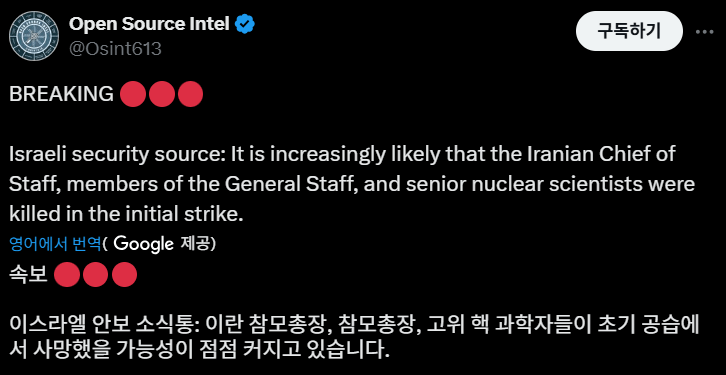 이스라엘 "첫 공습에 이란 참모총장, 고위 핵과학자들 사망한 것 같음"