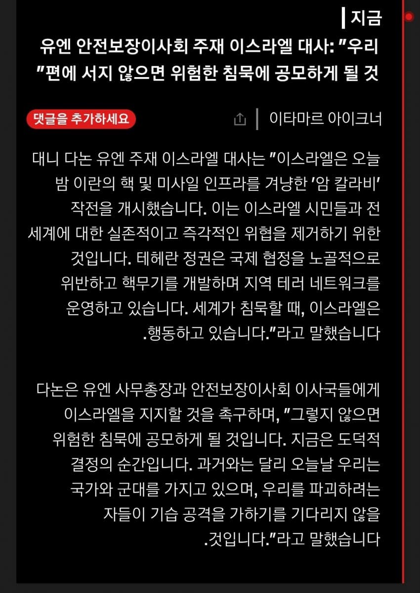 이스라엘 "우리편에 서지않고 침묵하는 전세계 모든 나라는 공범으로 취급"
