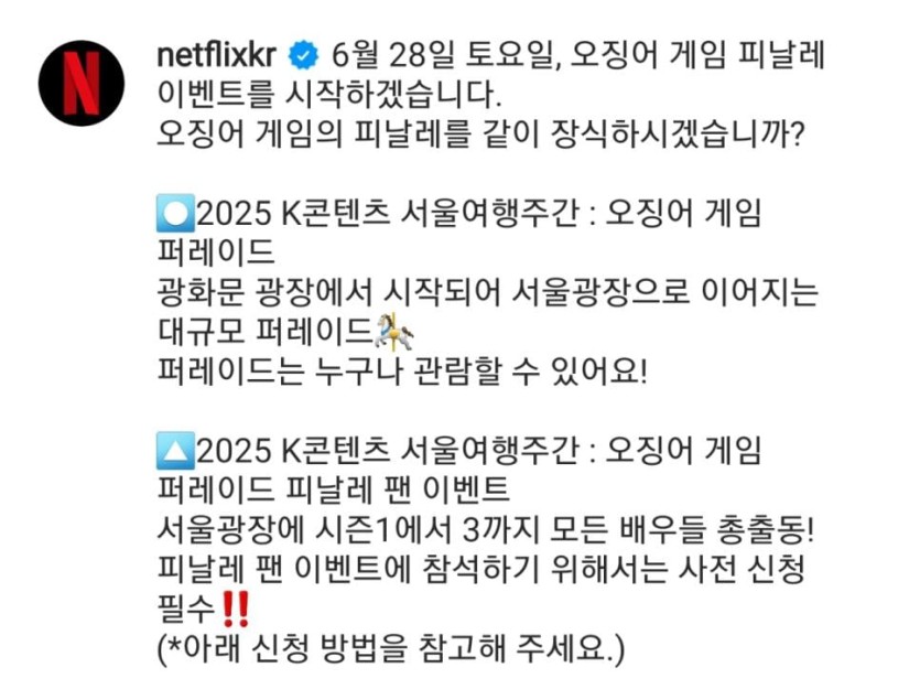 <오징어게임3> 광화문 대규모 퍼레이드 예정 rh1 0 96 0 2025.06.13 10:45 광화문부터 시청 광장까지 퍼레이드서울 광장 행사에 시즌 1‐3 모든 배우 참가유튜브 생중계 예정 0