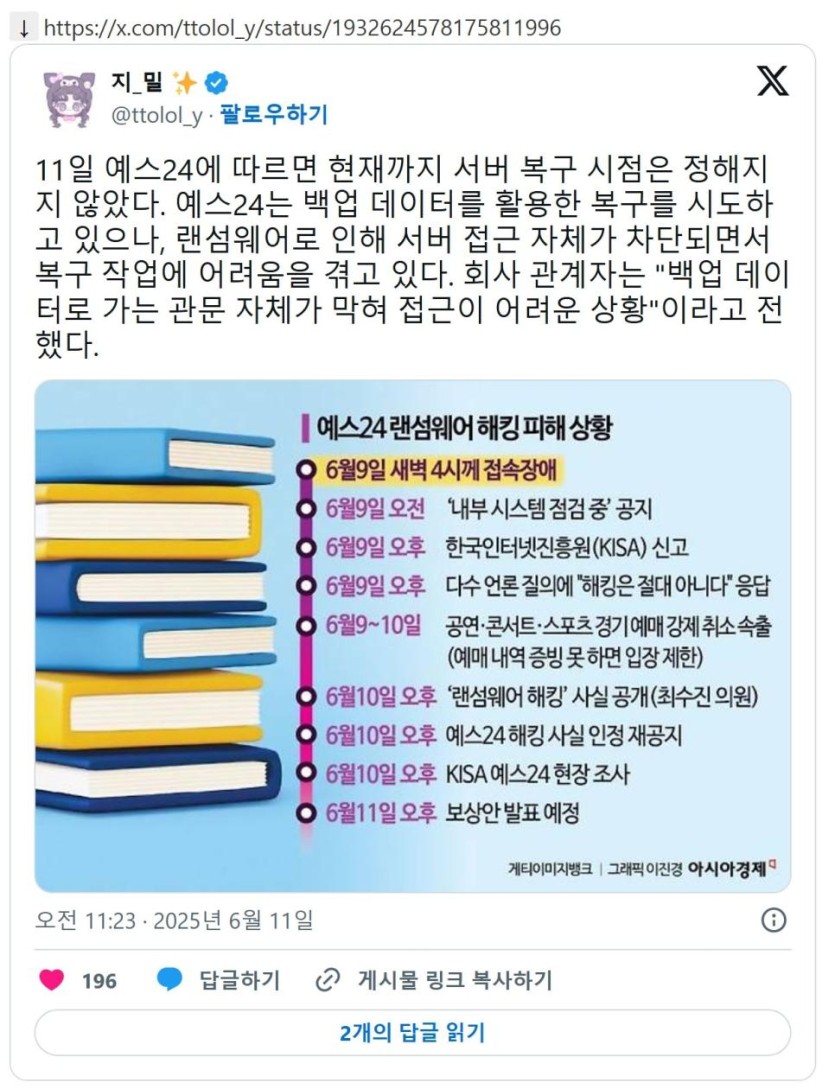 랜섬웨어 복구 과정이 심각해보이는 YES24