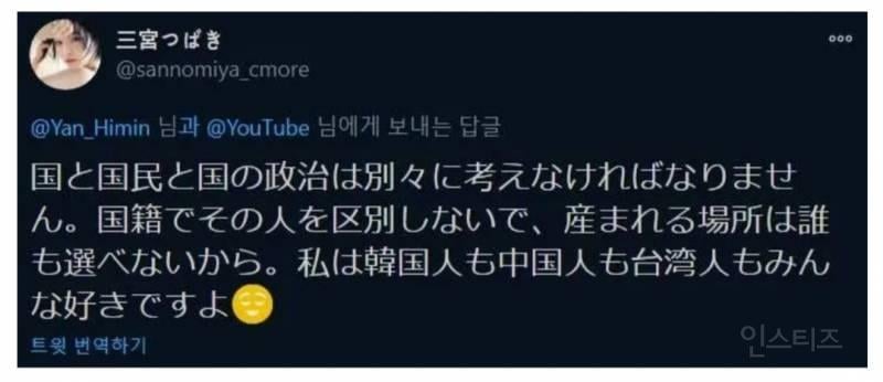 혐한을 대하는 일본 AV 여배우의 적절한 대응 rh1 0 97 0 2025.06.12 20:30 물들어 올 때 열심히 노 젓고 있는 츠바키.한국어로 트윗을 합니다.여기에 달린 트윗"저는 개인적으로 한국인이 싫어요." -> 글쓴이는 중국인;;;츠 바키의 반박"국가와 국민과 국가의 정치는 따로 생각해야 합니다.국적 구분 없이 태어나는 장소는 아무도 선택할 수 없기 때문입니다.저는 한국인도 중국인도 대만인도 모두 좋아합니다."산노미야 츠바키항상 응원하겠습니다. 항상 감사합니다. 0