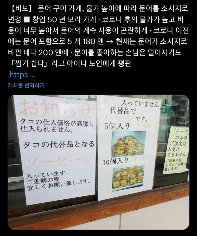 열도의 타코야키 근황.JPG rh1 0 80 0 2025.06.12 02:30 50년 된 타코야키집이 문어를 포함한 물가 인상을 버티지 못해서문어 대신 소세지를 넣고 판매하기 시작가격도 20엔 더 올라감타코야키가 타코야키가 아니게 되어버림 0