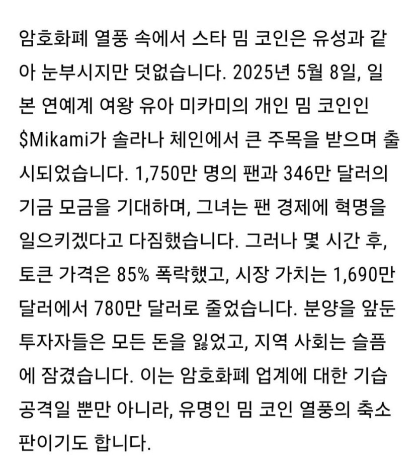 av 배우 미카미 유아 밈코인 사기 논란 rh1 0 98 0 2025.06.11 23:45 미카미 유아 이름을딴 MIKAMI코인 출시하고 상장했는데 상장하자마자 대폭락 그런데 미카미 유아는 상장하자마자 자신이 갖고있던 코인을 다팔아서 엄청난 수익을 올렸다는 소문이있음 팬들의 돈은 하루아침에 종이쪼가리됨 0