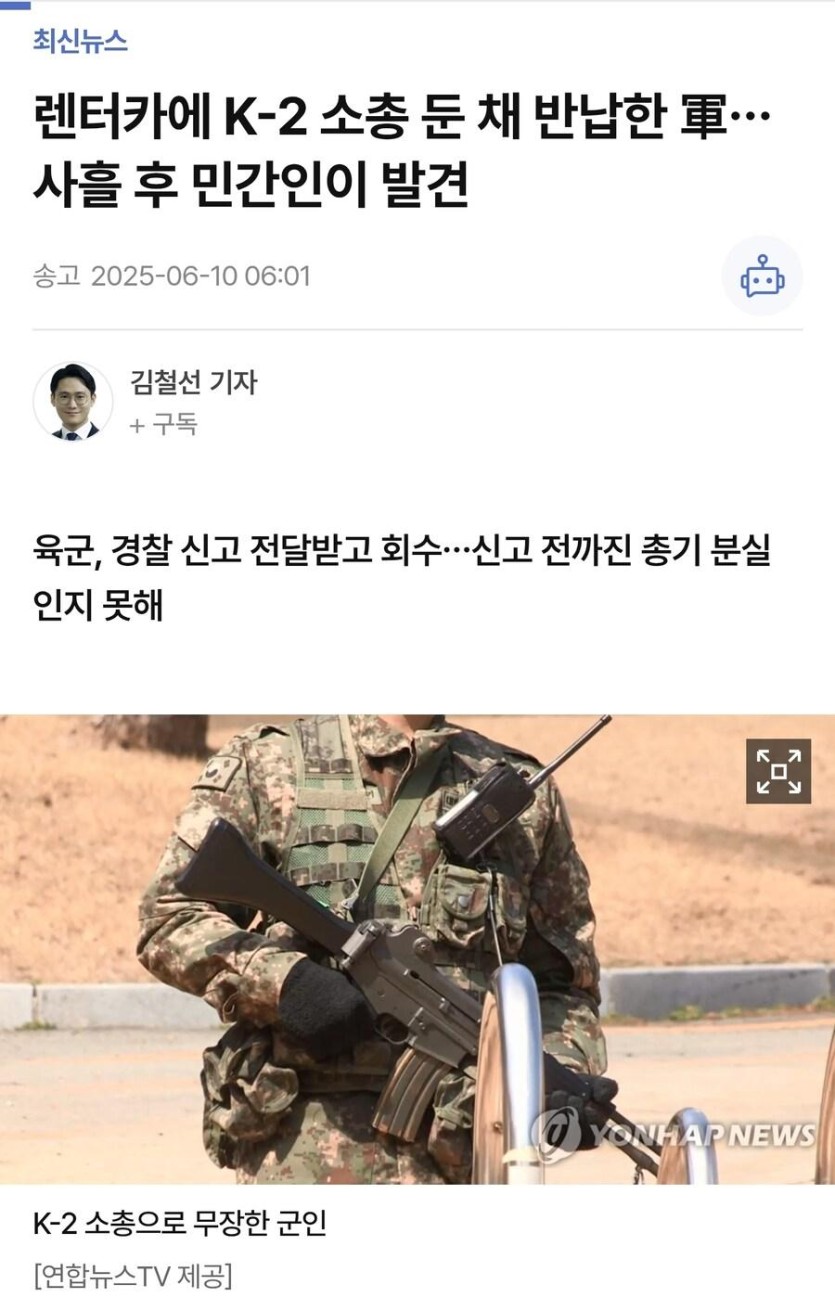 렌트카에 k-2 소총 둔 채 반납한 육군