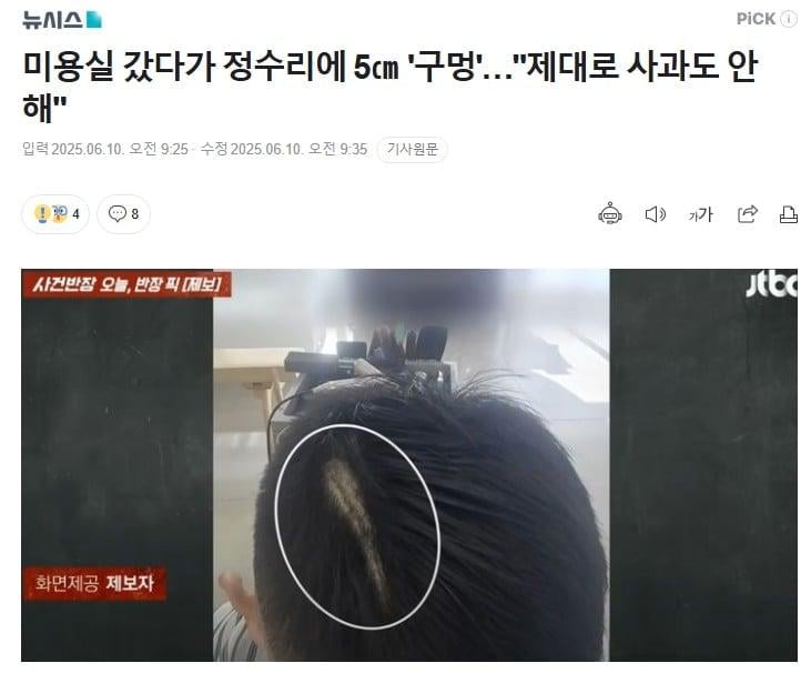 미용실 갔다가 정수리에 5㎝ '구멍'…"제대로 사과도 안 해"