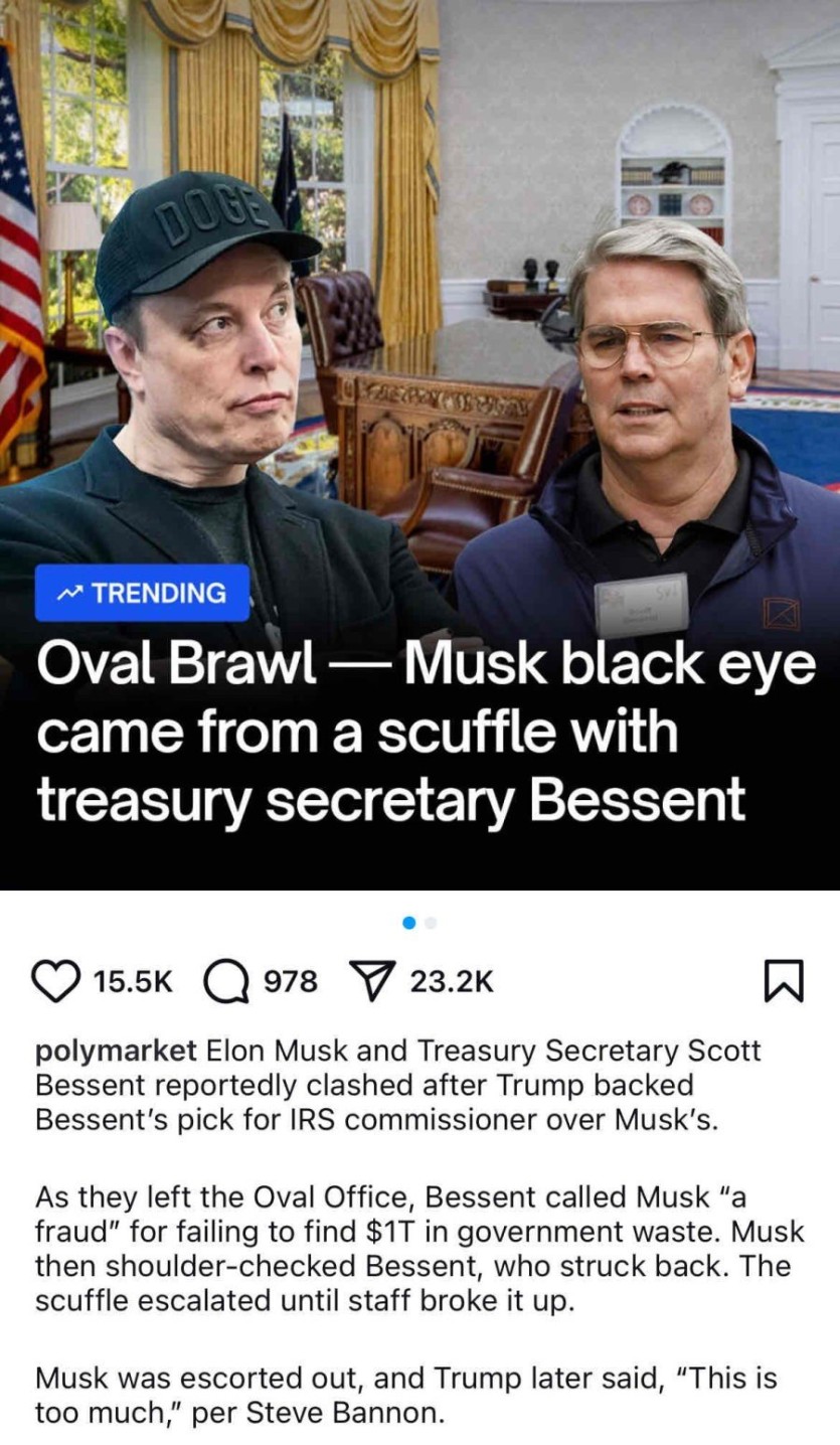 일론 머스크 눈에 멍든 (진짜) 이유가 밝혀짐 rh1 0 96 0 2025.06.10 11:15 재무장관 스캇베센트랑 한바탕했군요. 스캇이 일론한테 ‘사기꾼’ 이라 했더니 일론이 풋볼선수들 태클 하듯이 냅다 들이받았다고 하네요 ㅋ 일론 머스크 눈에 멍든 (진짜) 이유가 밝혀짐 0