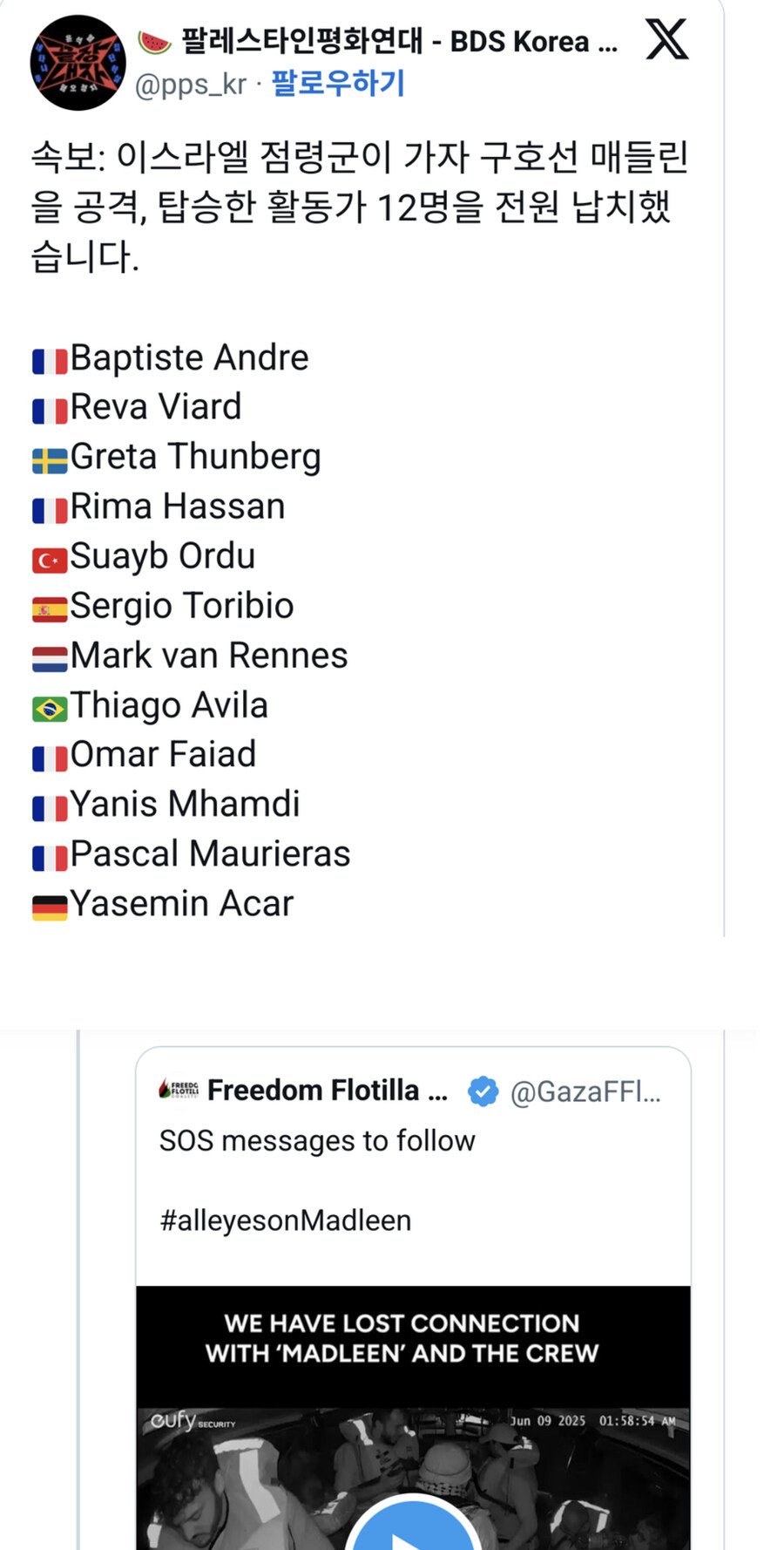그레타 툰베리포함 12명 이스라엘군에 납치되었다라고 썰 도는 중
