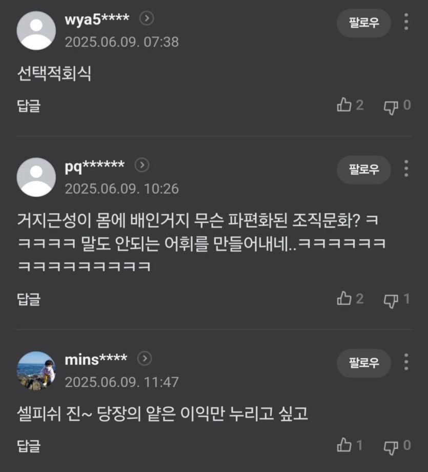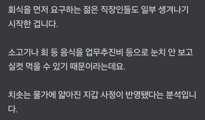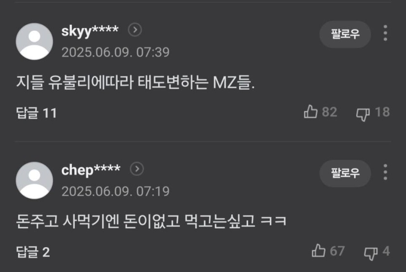 회식 요구하는 MZ세대... 얇아진 지갑 때문.jpg rh1 0 97 0 2025.06.09 14:45 회식피함 -> 이기적이고 개인주의가 심하다회식함 -> 거지근성, 돈이 없는거냐ㅜㅜ 0