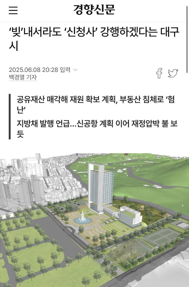 대구시 "빚" 내서라도 신청사 강행 ㄷㄷㄷ.jpg rh1 0 97 0 2025.06.09 15:30 https://n.news.naver.com/mnews/article/032/0003374789?sid=102 0