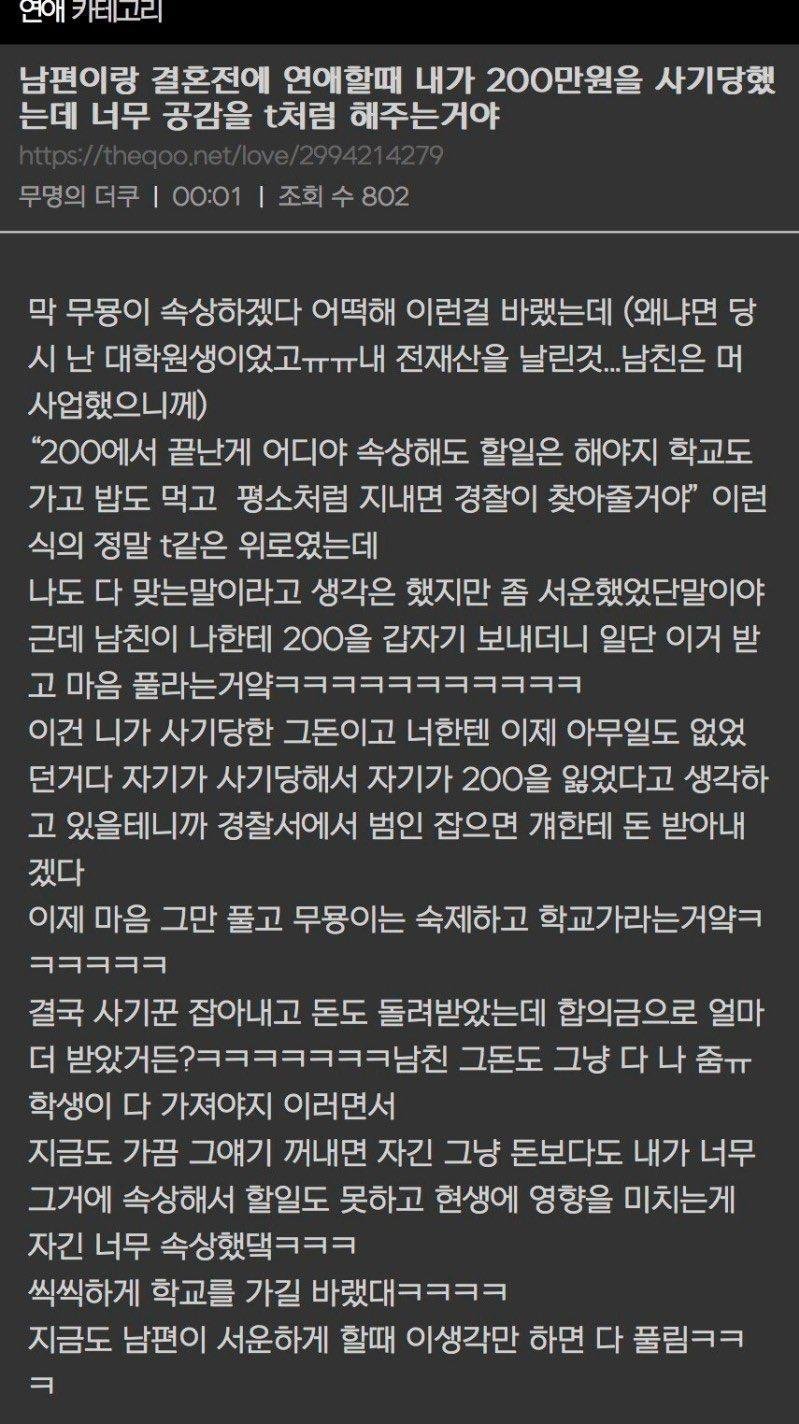 남편이랑 결혼전에 연애할때 내가 200만원을 사기당했는데 너무 공감을 t처럼 해주는거야