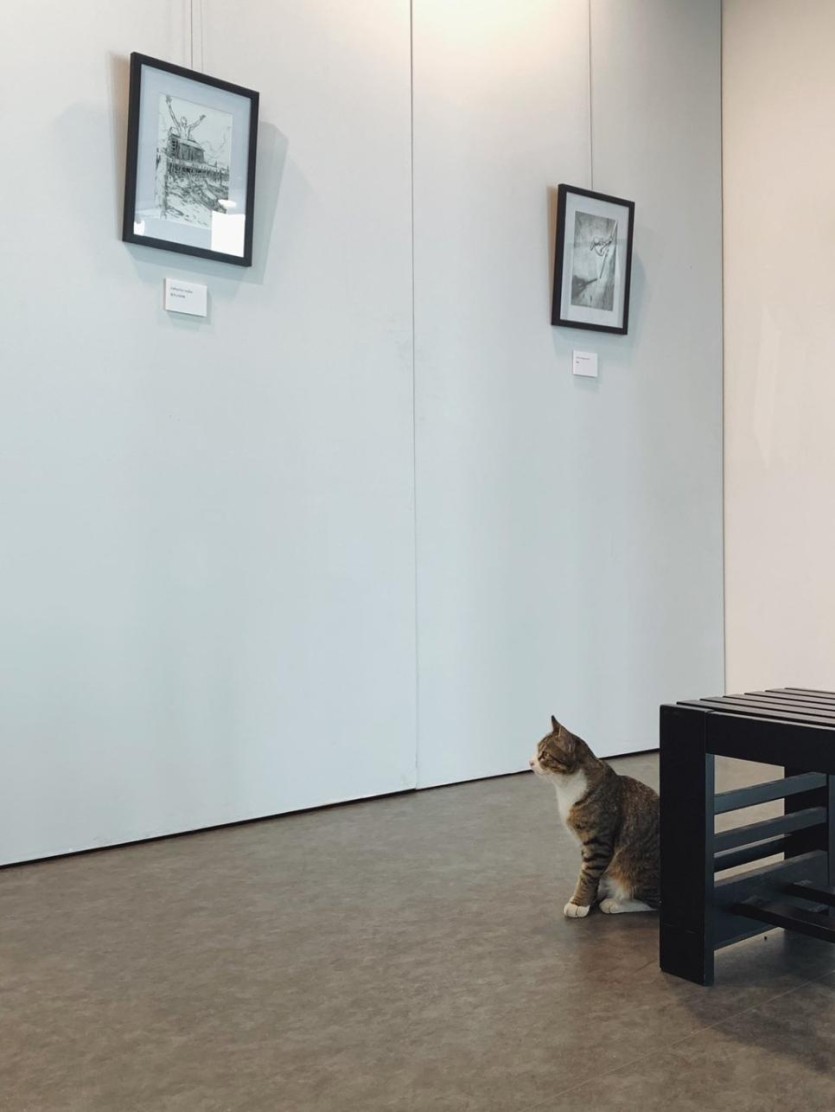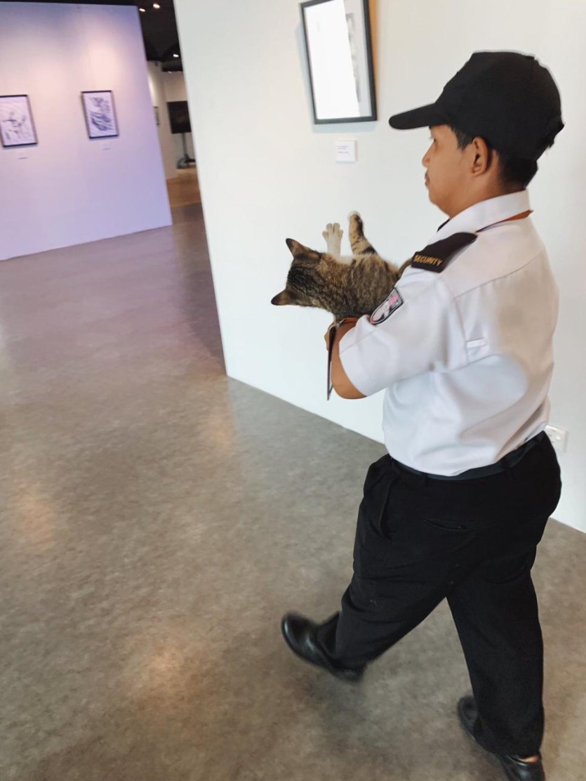 전시회 구경 왔다가 쫓겨나는 고양이