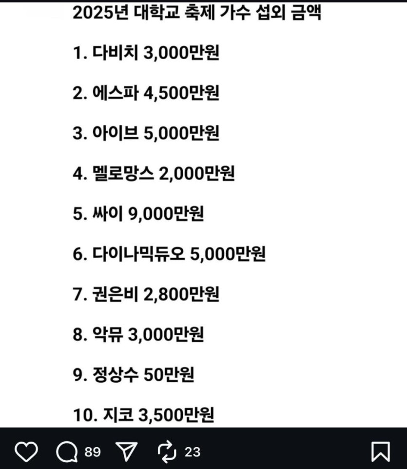 2025년 대학교 축제 가수 섭외 금액