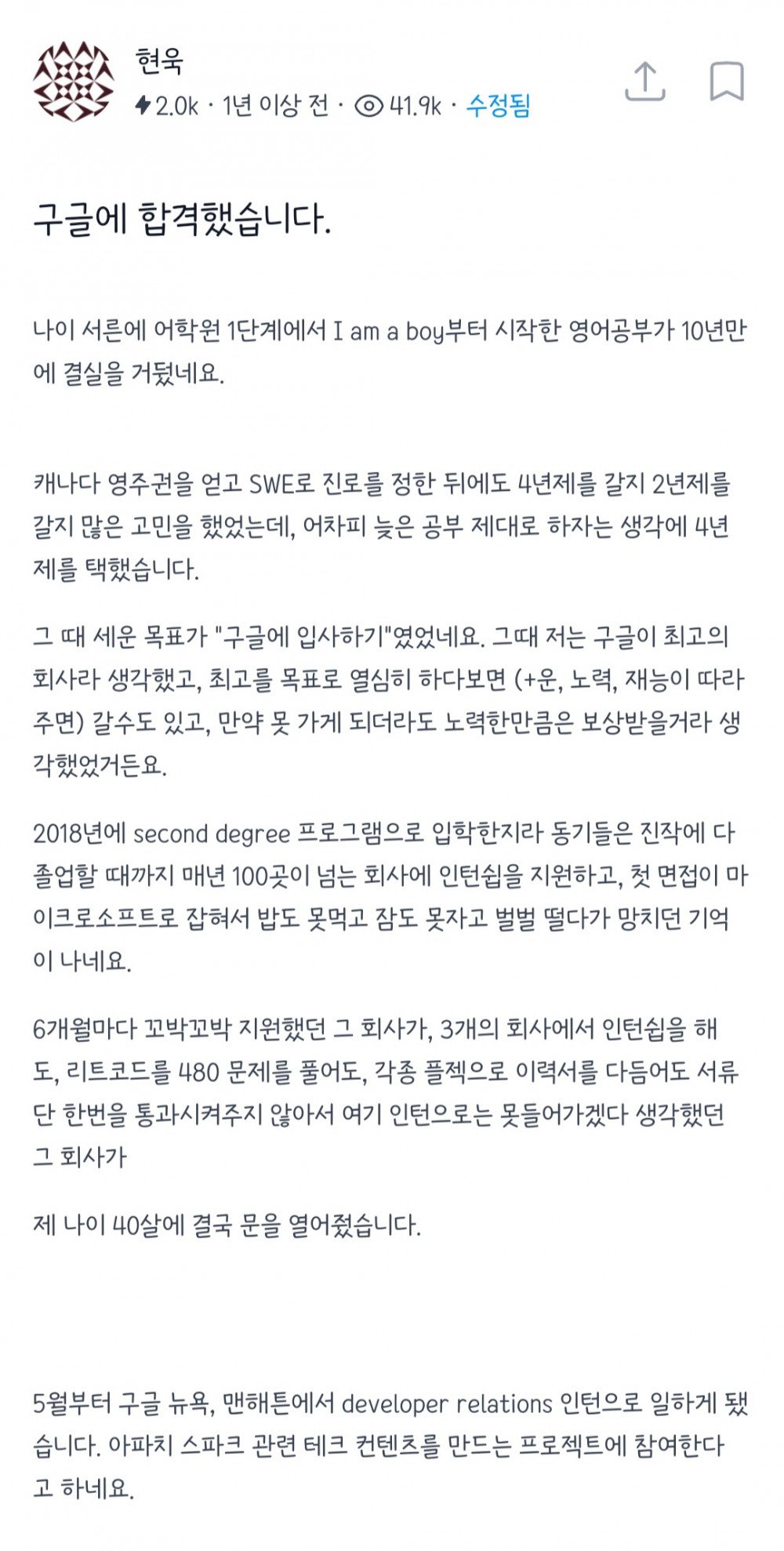 나이 40살에 구글 인턴으로 취업했던 한국 사람