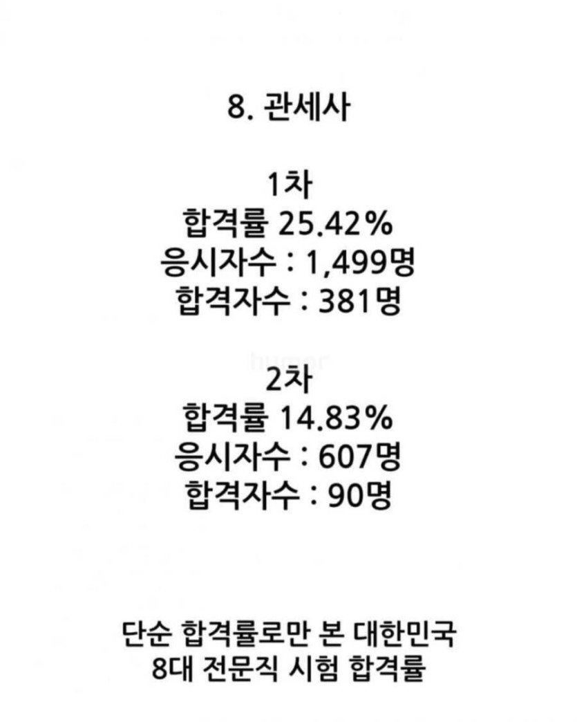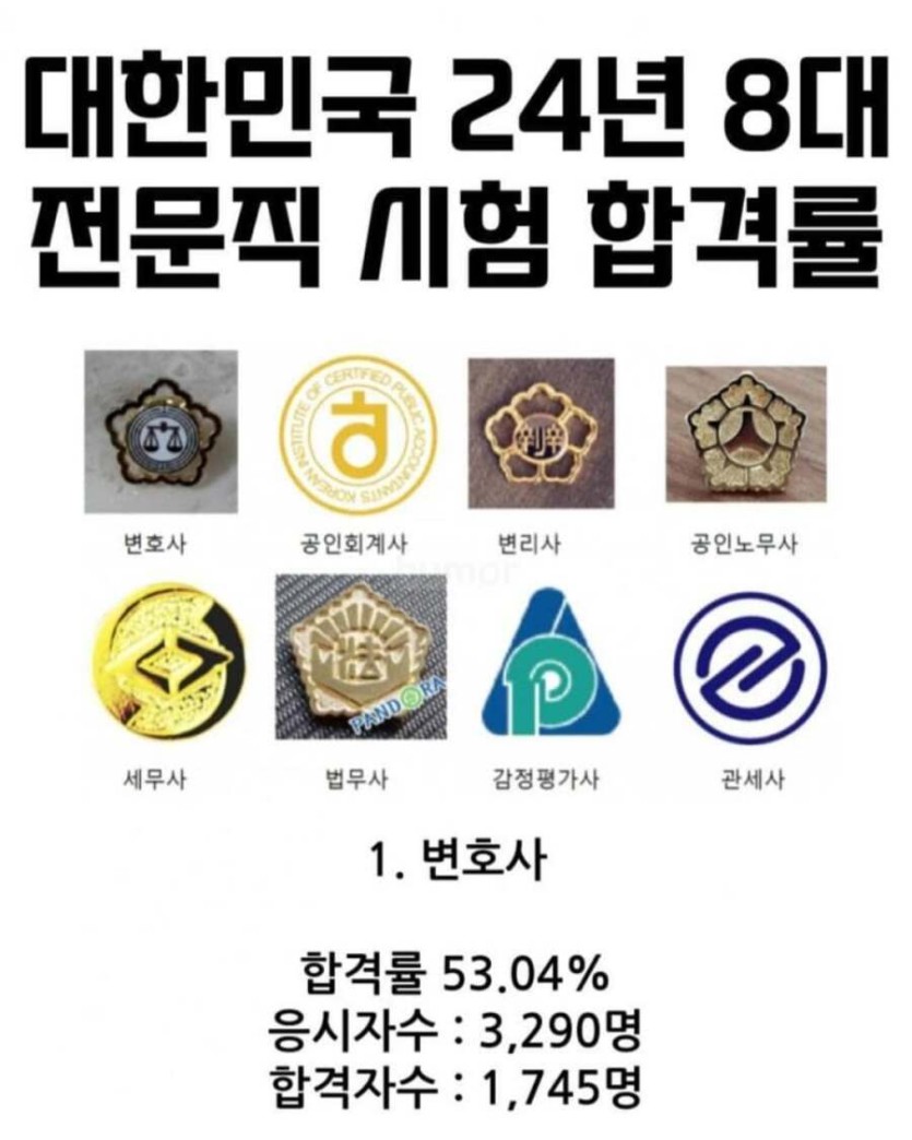 대한민국 8대 전문직 시험 합격률 rh1 0 108 0 2025.06.07 20:15 감평사는 1차 23% 합격하고, 그 중에서 7%만 합격하네요. ㄷㄷ 대한민국 8대 전문직 시험 합격률 0