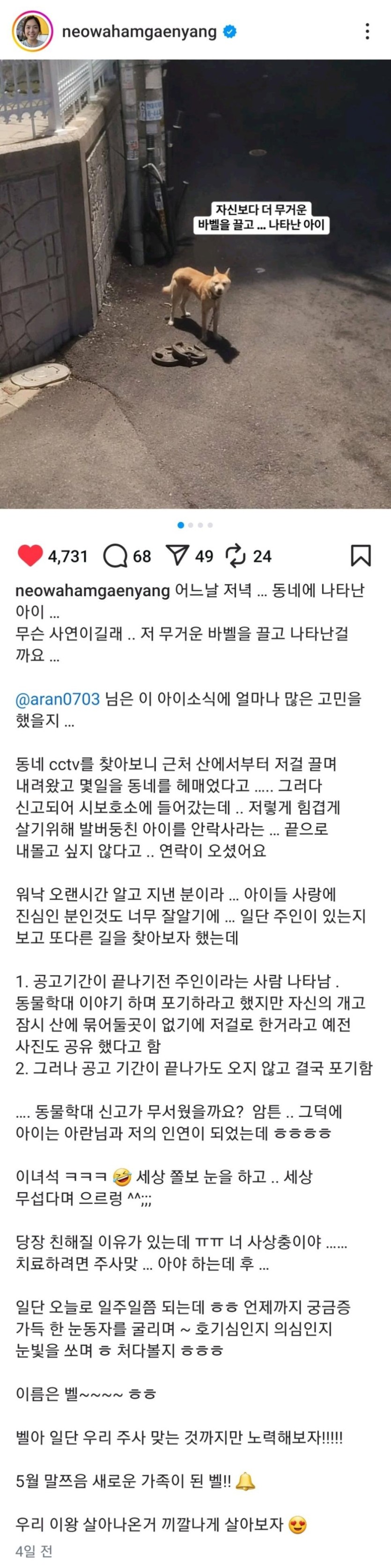 산에서 30KG 원판 끌고 내려온 강아지