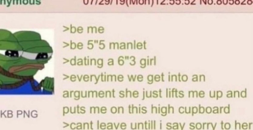 슬픈 키작남 이야기 rh1 0 98 0 2025.06.07 11:15 > 내 얘기임> 나 165 키작남> 여친은 190> 말싸움을 하게 되면 걘 항상 나를 번쩍 들어서 높은 찬장에 올려둠> 미안하다 사과하기 전까진 못내려감 0