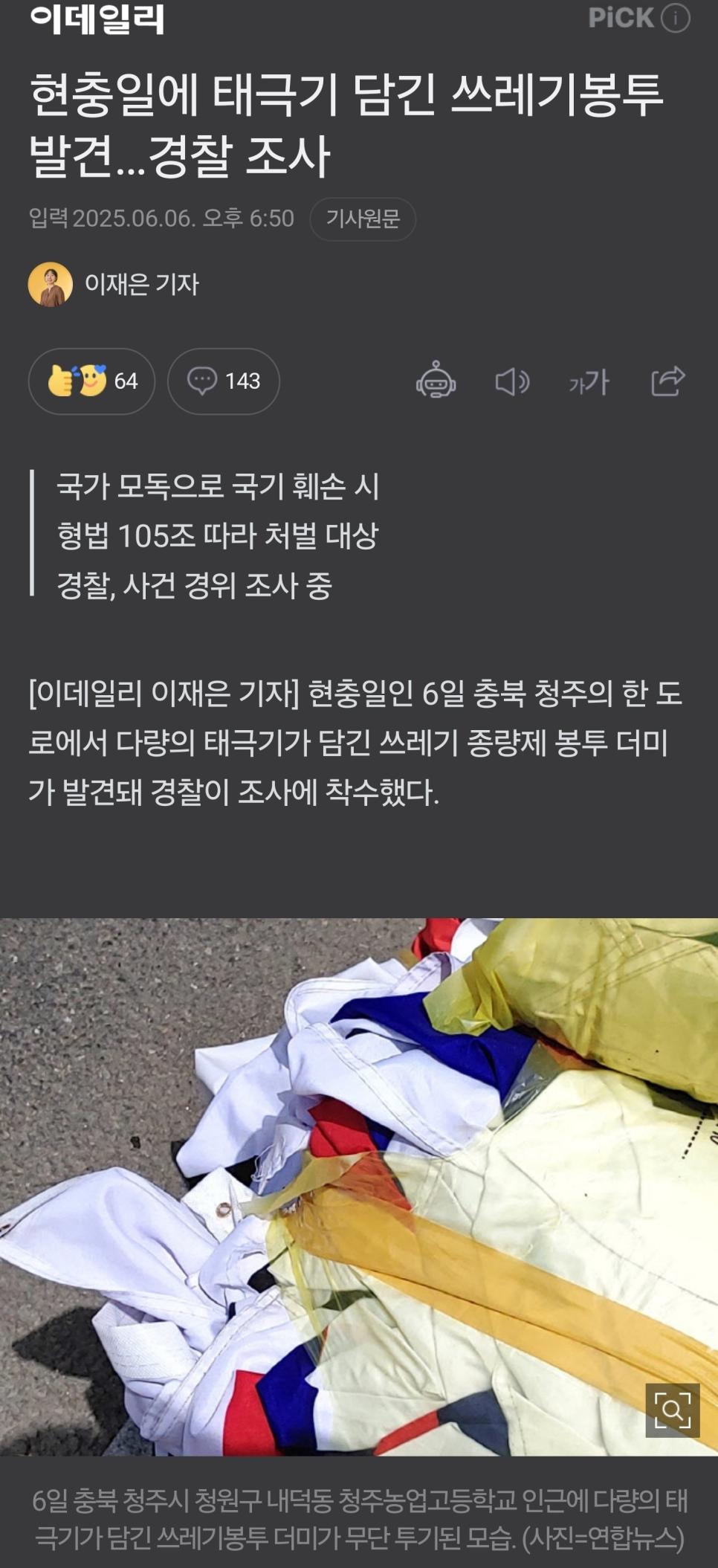 국가모독... 태극기 쓰레기봉투 경찰조사.jpg rh1 0 98 0 2025.06.07 12:15 https://n.news.naver.com/article/018/0006032958?ntype=RANKING 0