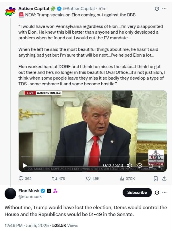 트럼프랑 머스크 싸움 개웃기네.JPG rh1 0 98 0 2025.06.06 22:00 트럼프 당선 되고 머스크랑 둘이 어화둥둥 염병 하길래저 둘 다 성격이 관종이라 서로 절대 같이 오래 못하고 싸우겠다 싶었는데아니나 다를까 개 추하게 서로 폭로전에 싸우네너 약쟁이 vs 나 아녔음 대통령 아니었어 + 문서 폭로저딴 놈들이 대통령이랑 한 때 인류를 구원하려고 했다던 기업 수장이라니 0