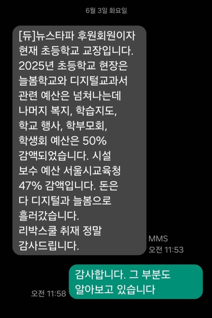 봉지욱 기자가 초등 교장선생님한테 받은 문자