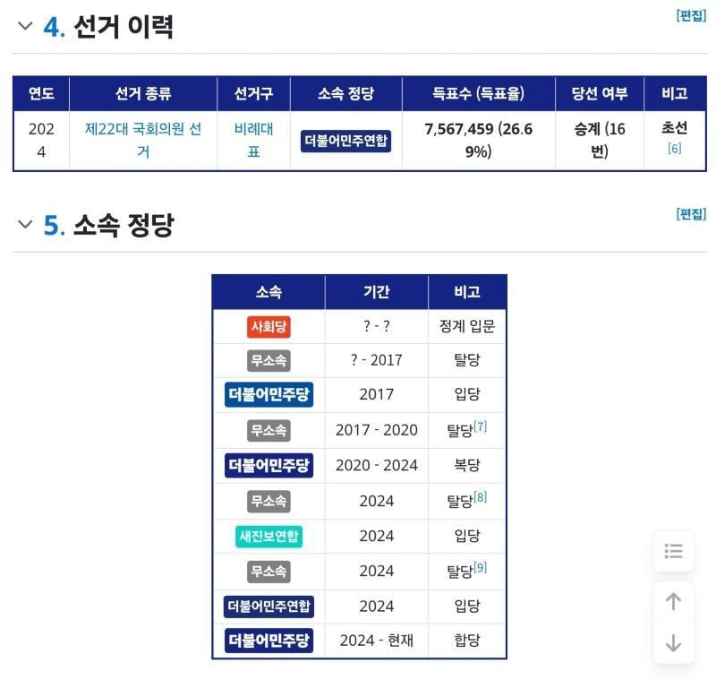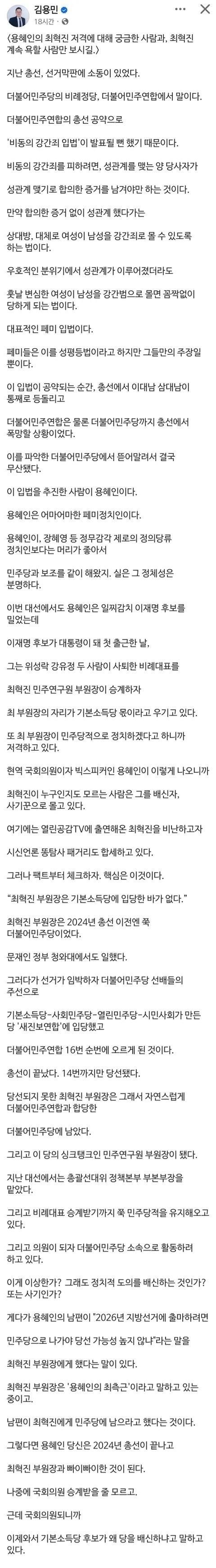 펌] 김용민 pd - 용혜인 최혁진 저격에 대해서 rh1 0 97 0 2025.06.06 17:15 최혁진 정당이력 (나무위키 펌)용혜인-최혁진 사이에 사적으로 무슨 일이 있었을지는 모르겠지만 용혜인이 왜 저러는지 이해는 안되네요... 0