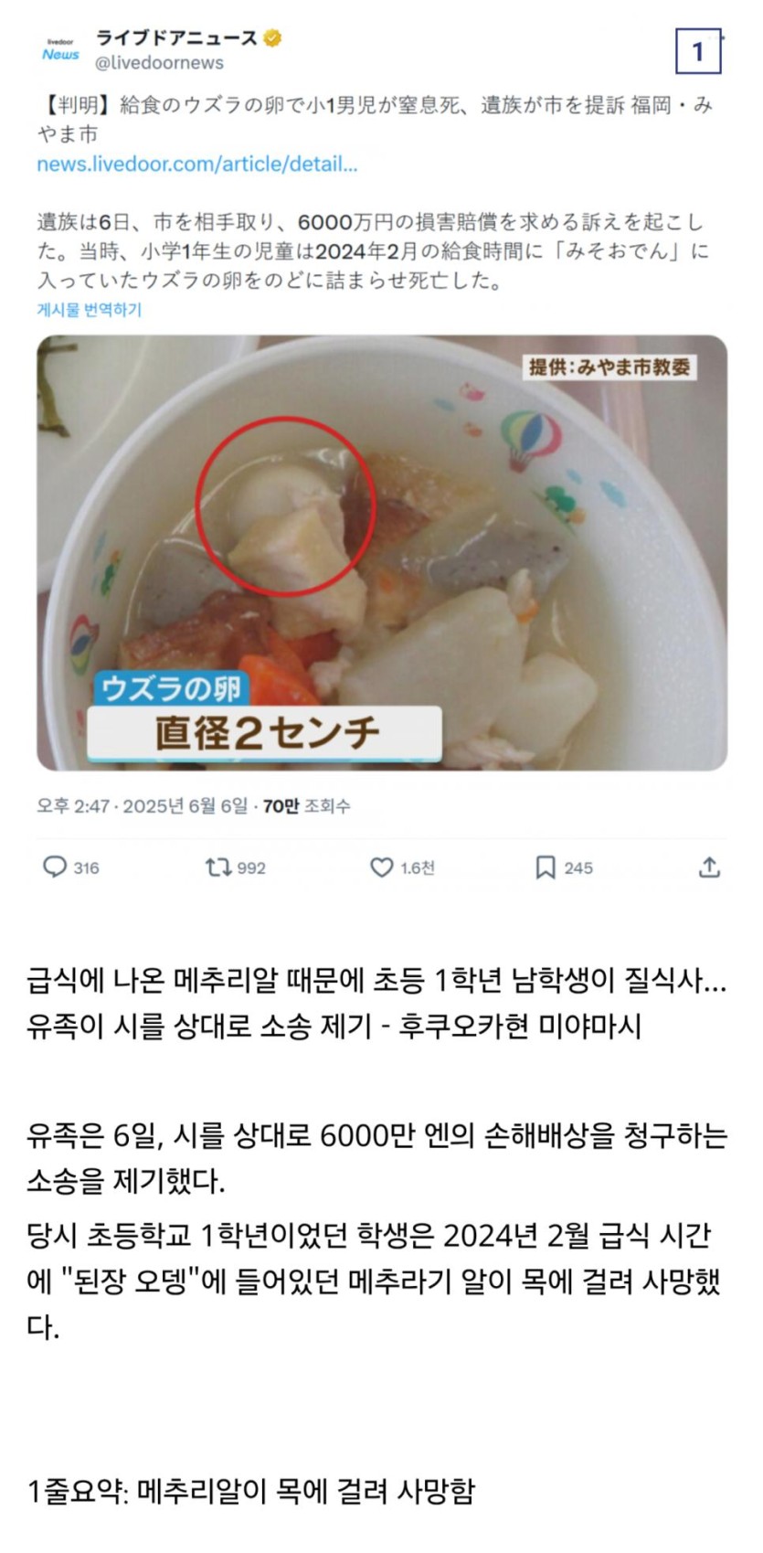 오늘자 일본 톱 뉴스...급식 먹다가 목에 걸려서 사망