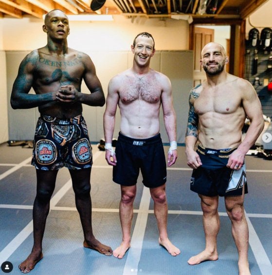 이스라엘 아데산야 UFC 선수(왼쪽), 마크 저커버그(가운데), 알렉산 볼카노프스키 UFC 선수