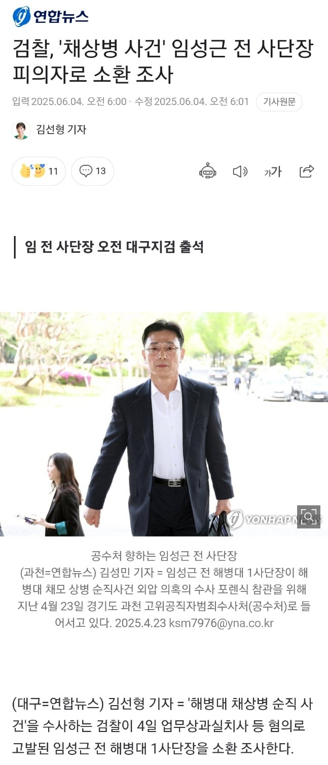 검찰, '채상병 사건' 임성근 전 사단장 피의자로 소환 조사