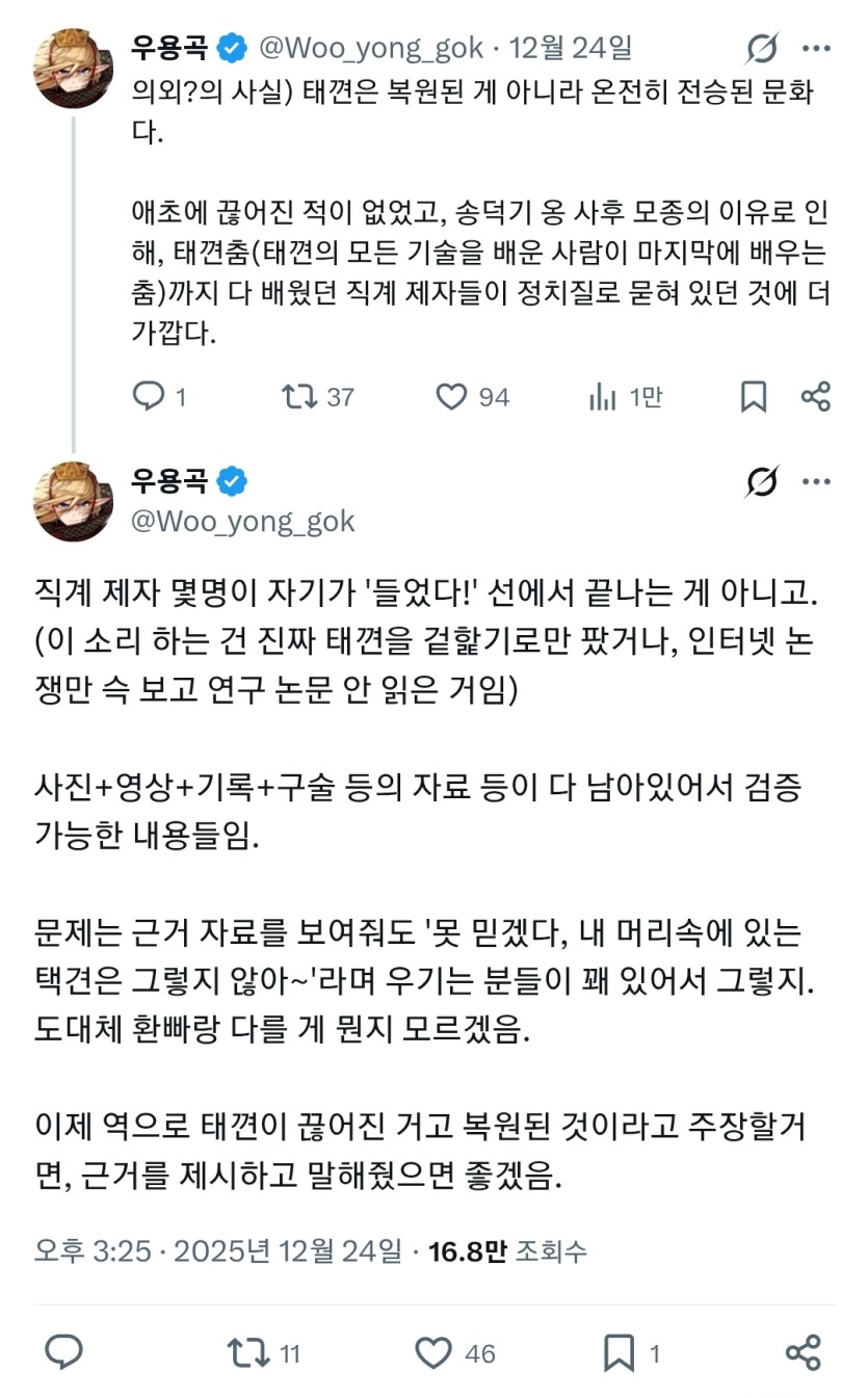 기타 게시판 - 택껸문제로 골치 썩고 있는 조선 깐프 작가 rotla 0 39 0 2025.12.26 09:36 맥이 끊겼다 > 복원됐다 고 우겨야 그 복원 과정이나 역사에 대한 부각을 입맛대로 해서 하나 해먹으려고 하는 작자들일 수도 있고 아니면 한복 가지고 지랄 할 때 같은 그냥 지랄인지 혹은 한국 걸 깔아 뭉개고 싶은 친구들인지 복원됐다고 주장하는 경우 택견이 송덕기사범때 자료가 하나도 없어서 소실되었고, 다시 살아났다근데 우용곡님이 트위터에 올린게 송덕기사범님 택견 영상자료 눈 가리고 아웅식인 주장 0