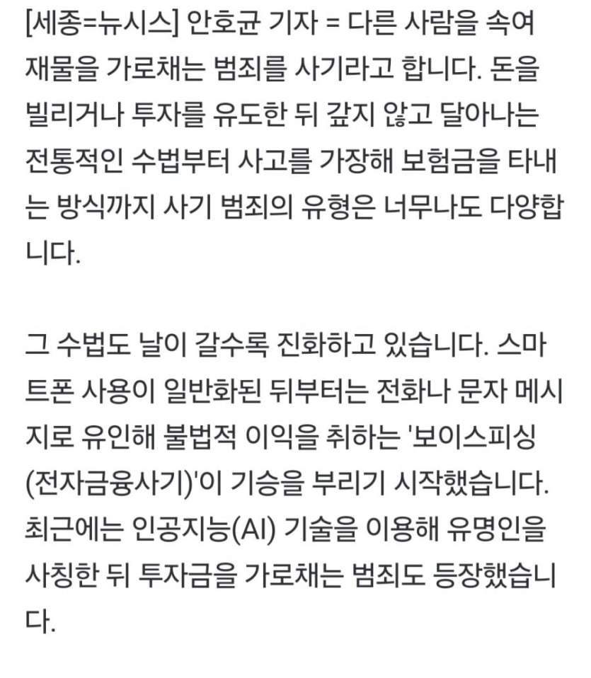 삶 팍팍한데 작년 사기 범죄 40만건 rh1 0 324 0 2025.03.29 16:15 주요 경제범죄의 양상도 바뀜 2009년엔 강도사건이 한해 6300건 넘게 발생했으나사기는 22만건이었고 2020년대 들어와서 강도는 500~700건대를 유지하고있으나 사기범죄는 30만건이상을 기록함 특히 작년은 43만건으로 역대 1위 삶 팍팍한데 작년 사기 범죄 40만건 0