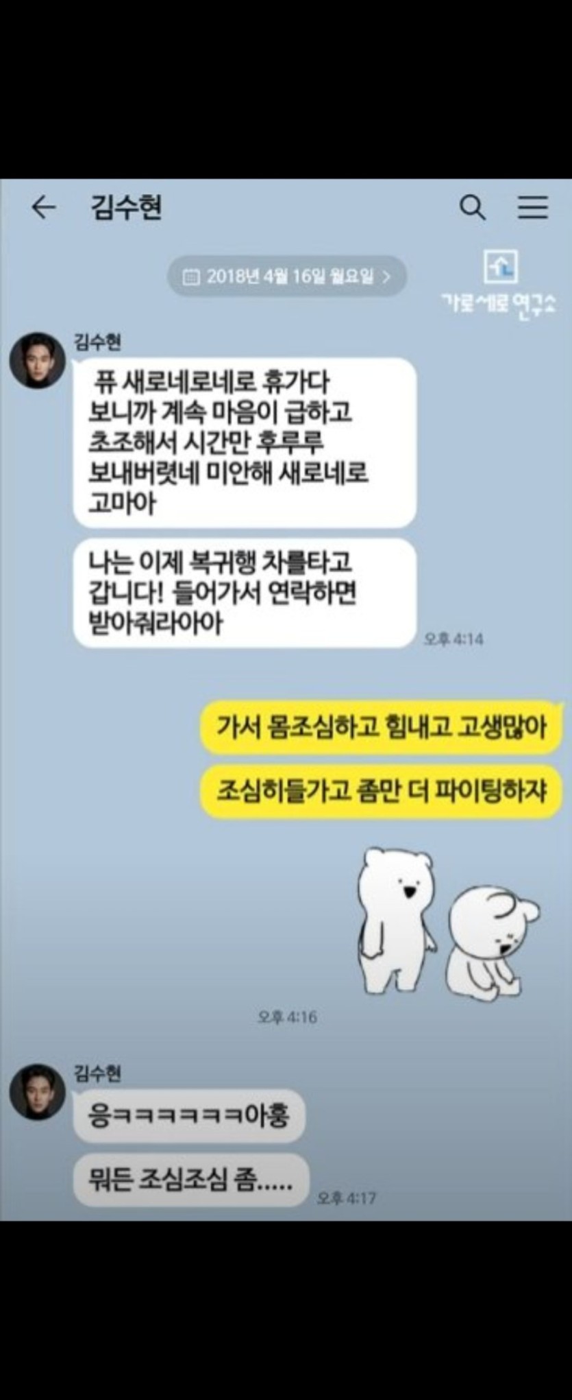 김수현 2016년 VS 2018년 카톡 비교 rh1 0 175 0 2025.03.29 09:15 2016년 김수현 만 28세 김새론 만 15세 2018년 김수현 만 30세 김새론 만 17세 김수현 2016년 VS 2018년 카톡 비교 0