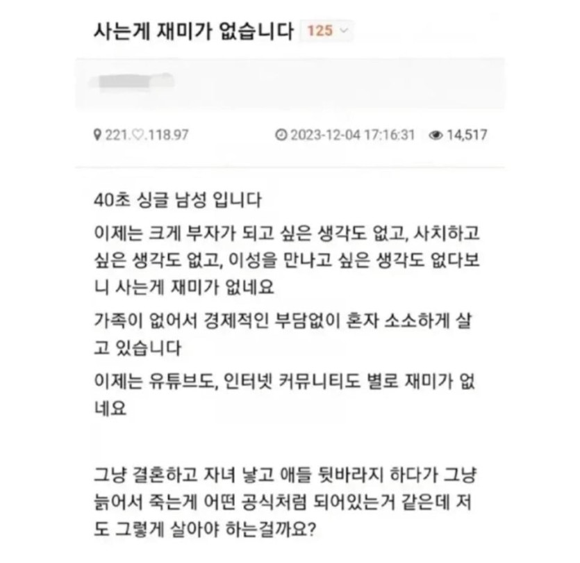 사는 게 재미 없다는 40대 미혼남.jpg