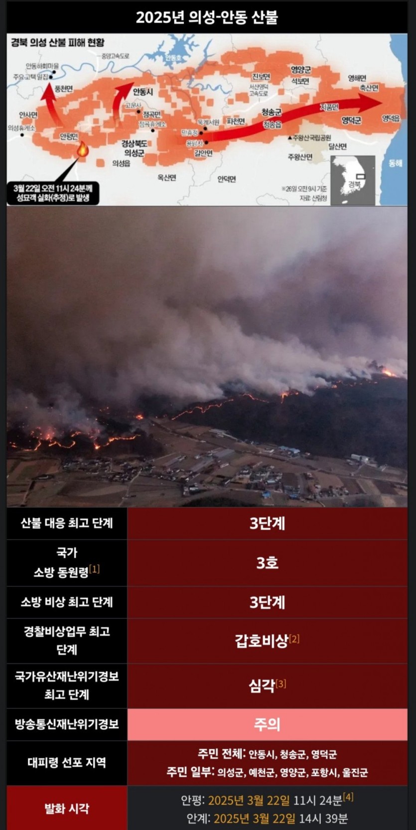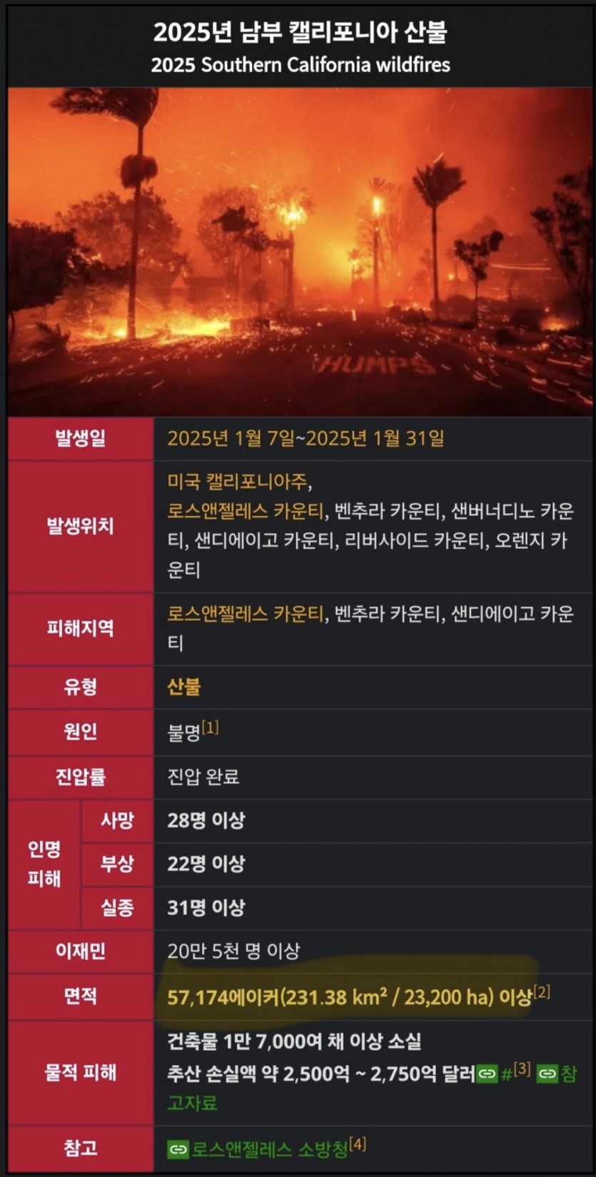 LA 산불의 피해면적 4배가 된 경북 산불 rh1 0 221 0 2025.03.27 00:15 올해 초, 전세계를 떠들썩하게 했던 미국 남부 캘리포니아 산불 엄청난 피해를 발생시킨 당시 LA 산불의 피해 면적은 23,200 헥타르 / 231.38 제곱킬로미터 였다 그리고 현재 우리나라의 경북 의성 안동 산불의 피해 면적은.. 4배 가량인, 무려 87,249 헥타르 / 872.49 제곱킬로미터이다 문제는 이것이 확정된 수치가 아니라 현재진행형이라, LA산불의 4배 규모 이상이 될지도 모른다는 것 아무쪼록 더이상 큰 피해 없이 진화 처리가 이뤄지길 LA 산불의 피해면적 4배가 된 경북 산불 0
