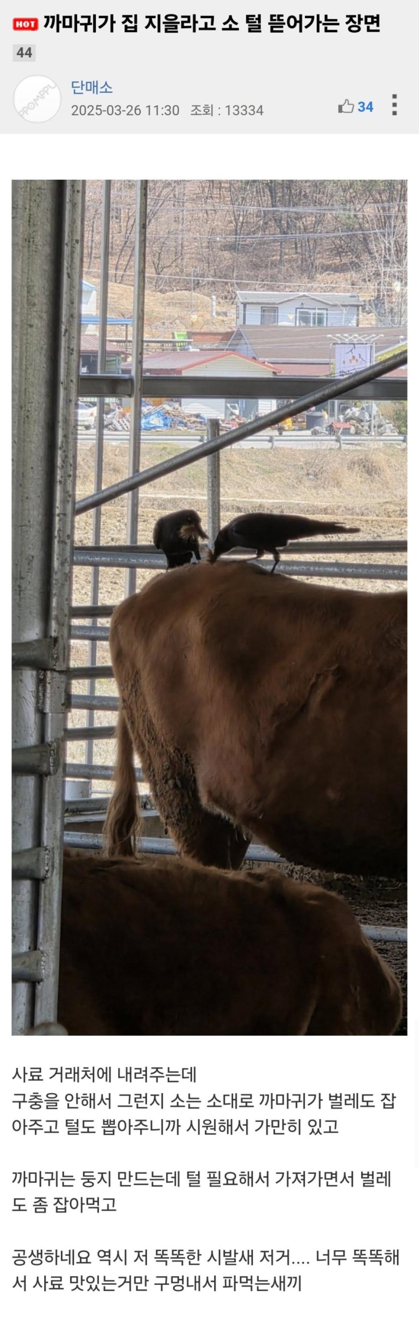 까마귀가 둥지 지으려고 소 털 뜯어가는 장면.jpg