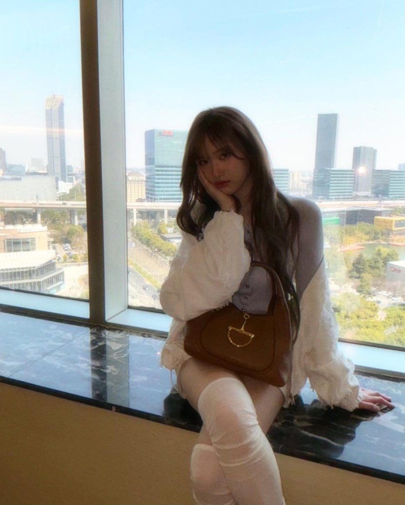 창 난간에 걸터앉은 아이브 이서...흰 니삭스 다리 꼰 허벅지