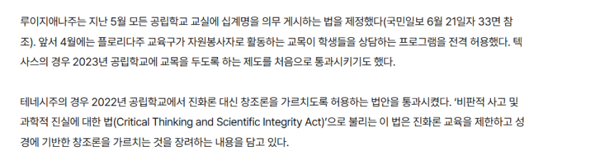 -오클라호마주는 성경 교육 의무화 -루이지애나주는 교실내 십계명 게시 의무화 -플로리다주, 텍사스주는 교목의 학생상담 허용 -테네시주는 창조론 교육 허용