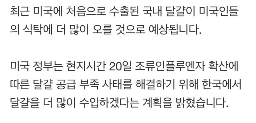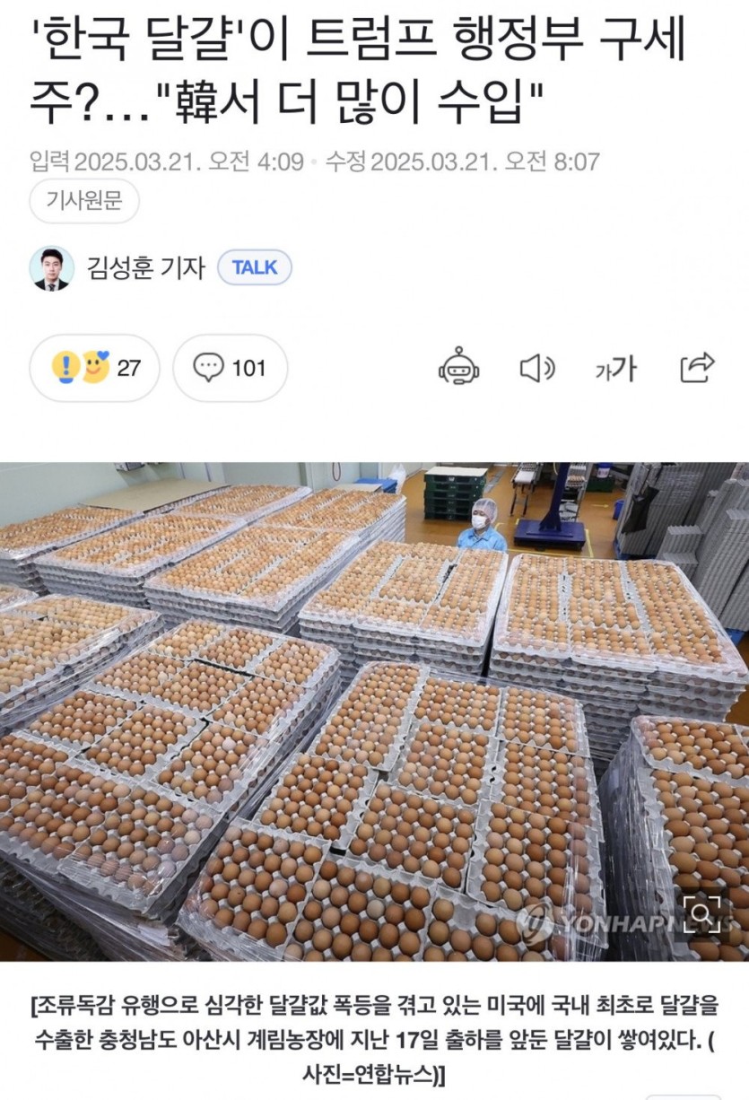 현재 불안하다는 한국 달걀 근황 rh1 0 195 0 2025.03.23 00:15 최초로 미국 수출중 이거 핑계로 계란값 올릴꺼 같다고 불안하다고 함 현재 불안하다는 한국 달걀 근황 0