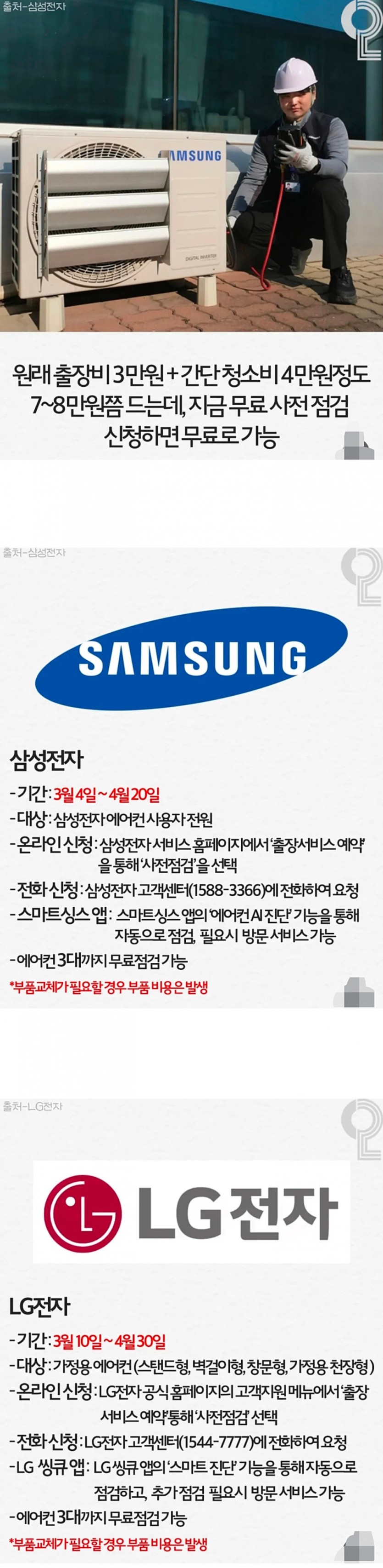 삼성이나 엘지 에어컨 여름 오기전에 무료로 점검 받는 방법 rh1 0 141 0 2025.03.22 18:15 오! ? 삼성이나 엘지 에어컨 여름 오기전에 무료로 점검 받는 방법 0