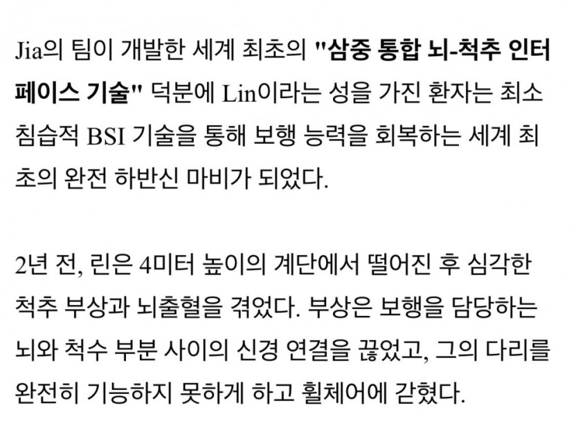 세계최초로 하반신마비, 뇌-척수 인터페이스 입증 성공 rh1 0 155 0 2025.03.22 18:15 뇌-척수 인터페이스는 뇌와 척수 사이의 신경연결을 복원하거나 신호를 우회하는 기술임 2024년에 세계최초로 뇌-척수 인터페이스 개념으로 3건의 수술을 진행했고 수술에 성공해서 기술 가능성을 보여줬었고 그러다 2025년 3월에 진행한 수술에서 하반신 마비 환자가 다리를 움직일 수 있게 되었음 최소침습수술로 진행됐고 기존보다 절개부위가 상당히 좁은게 특징이라 수술 후 회복도 빨리됨 추가적으로 임상실험 더 해본다고 함 세계최초로 하반신마비, 뇌-척수 인터페이스 입증 성공 0