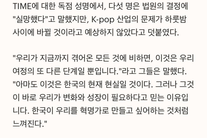 뉴진스, 한국이 우리를 혁명가로 만들고 싶어하는 것처럼 느껴진다 rh1 0 173 0 2025.03.22 03:45 https://time.com/7270186/njz-newjeans-exclusive-hybe-ador-legal-battle-complexcon-hongkong/ 0