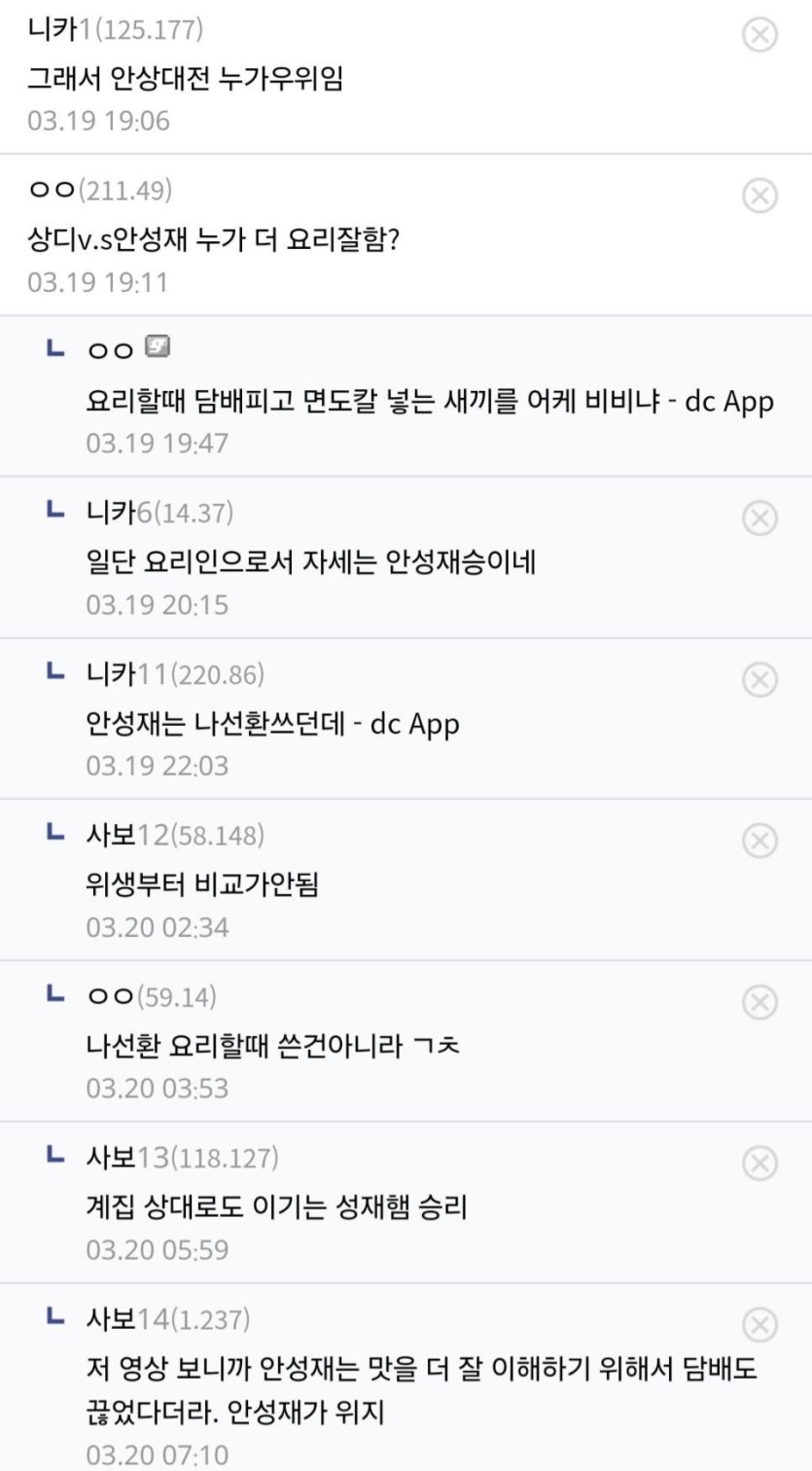 실시간 안성재 셰프 발언으로 난리난 디시인사이드 갤러리 .jpg rh1 0 218 0 2025.03.21 15:45 상안대전 반발담배피며 요리하는 요리사 호소인 상디 vs 미슐랭 쓰리스타 중장 안성재안밑상 0